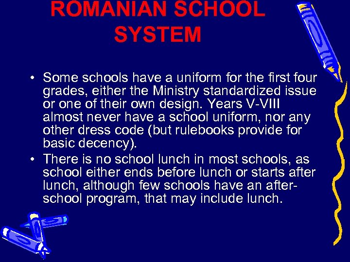 ROMANIAN SCHOOL SYSTEM • Some schools have a uniform for the first four grades, either the Ministry standardized issue or one of their own design. Years V-VIII almost never have a school uniform, nor any other dress code (but rulebooks provide for basic decency). • There is no school lunch in most schools, as school either ends before lunch or starts after lunch, although few schools have an afterschool program, that may include lunch.