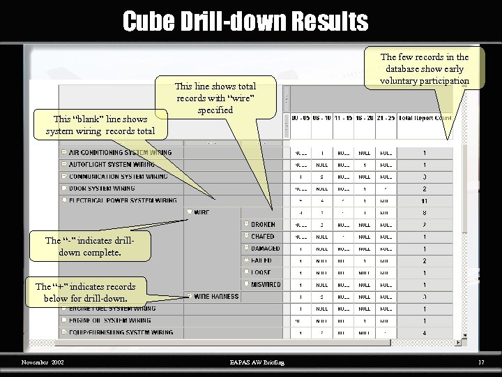 Cube Drill-down Results This “blank” line shows system wiring records total This line shows total records with “wire” specified The few records in the database show early voluntary participation The “-” indicates drilldown complete. The “+” indicates records below for drill-down. November 2002 EAPAS AW Briefing 17