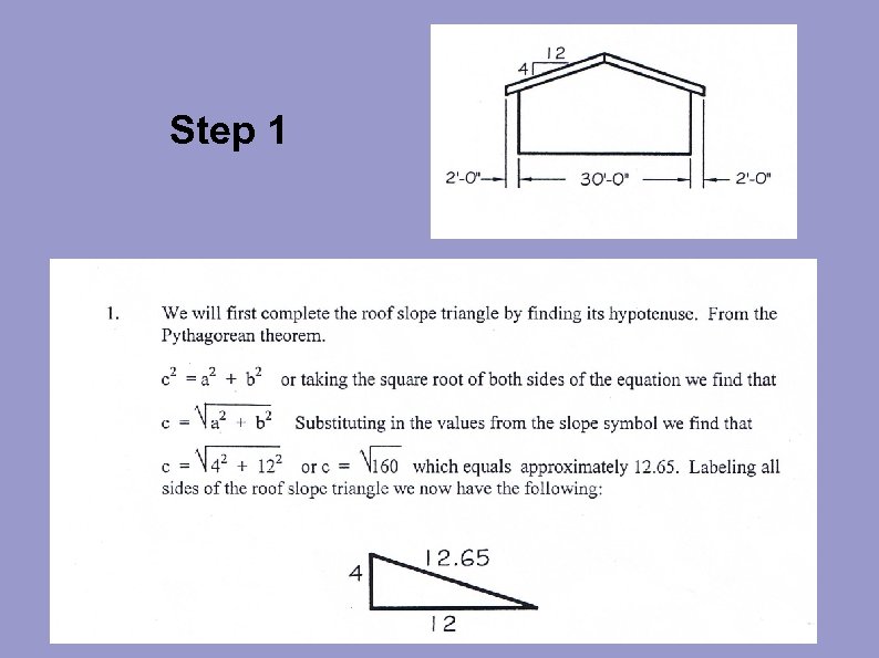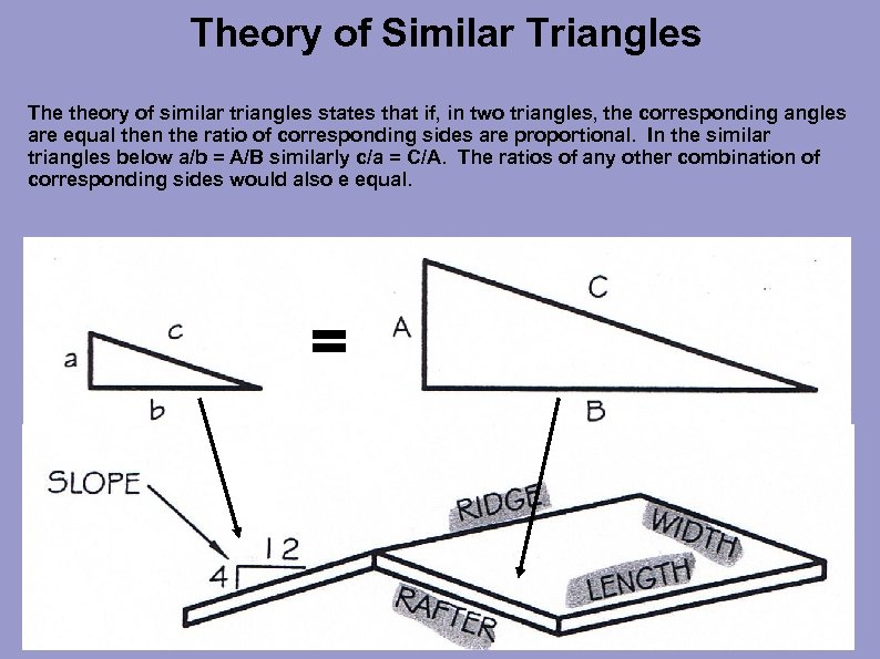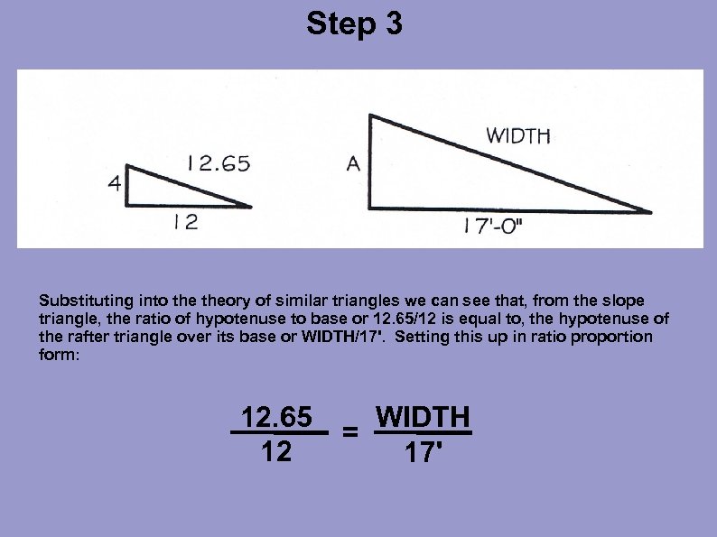 Step 3 Substituting into theory of similar triangles we can see that, from the slope triangle, the ratio of hypotenuse to base or 12. 65/12 is equal to, the hypotenuse of the rafter triangle over its base or WIDTH/17'. Setting this up in ratio proportion form: 12. 65 12 WIDTH = 17'