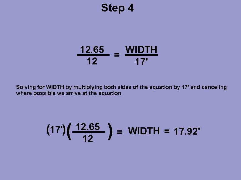 Step 4 12. 65 12 WIDTH = 17' Solving for WIDTH by multiplying both sides of the equation by 17' and canceling where possible we arrive at the equation. (17')( 12. 65 12 )= WIDTH = 17. 92'
