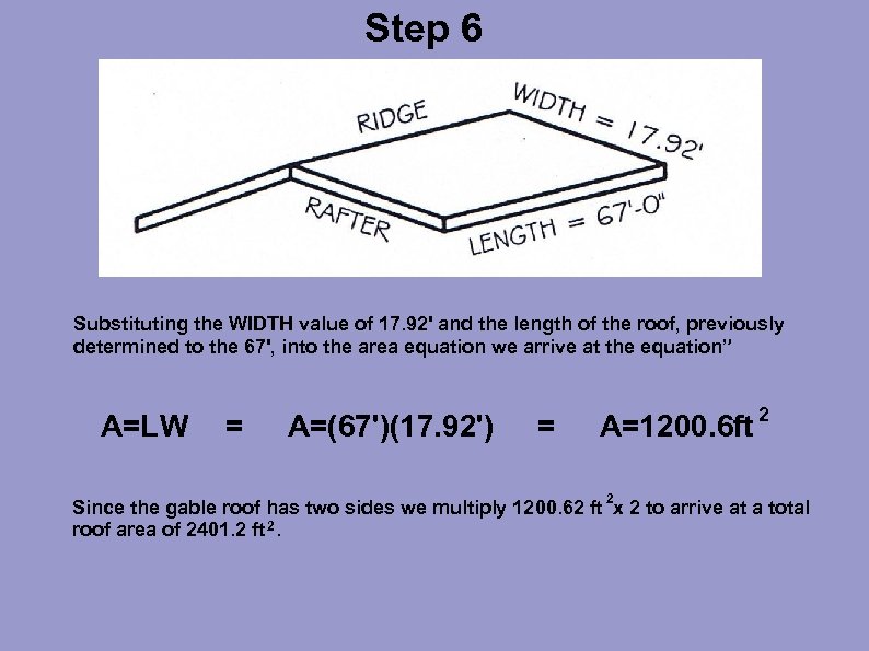 Step 6 Substituting the WIDTH value of 17. 92' and the length of the roof, previously determined to the 67', into the area equation we arrive at the equation” A=LW = A=(67')(17. 92') = A=1200. 6 ft 2 2 Since the gable roof has two sides we multiply 1200. 62 ft x 2 to arrive at a total roof area of 2401. 2 ft 2.