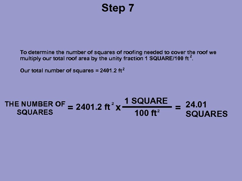Step 7 To determine the number of squares of roofing needed to cover the roof we multiply our total roof area by the unity fraction 1 SQUARE/100 ft 2. Our total number of squares = 2401. 2 ft 2 THE NUMBER OF SQUARES 1 SQUARE = 2401. 2 ft x 100 ft 2 = 24. 01 SQUARES 2