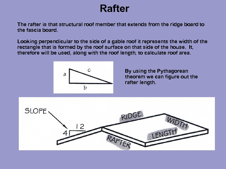 Rafter The rafter is that structural roof member that extends from the ridge board to the fascia board. Looking perpendicular to the side of a gable roof it represents the width of the rectangle that is formed by the roof surface on that side of the house. It, therefore will be used, along with the roof length, to calculate roof area. By using the Pythagorean theorem we can figure out the rafter length.
