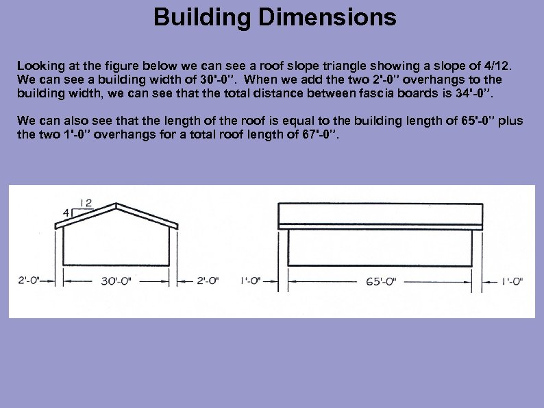 Building Dimensions Looking at the figure below we can see a roof slope triangle showing a slope of 4/12. We can see a building width of 30'-0”. When we add the two 2'-0” overhangs to the building width, we can see that the total distance between fascia boards is 34'-0”. We can also see that the length of the roof is equal to the building length of 65'-0” plus the two 1'-0” overhangs for a total roof length of 67'-0”.