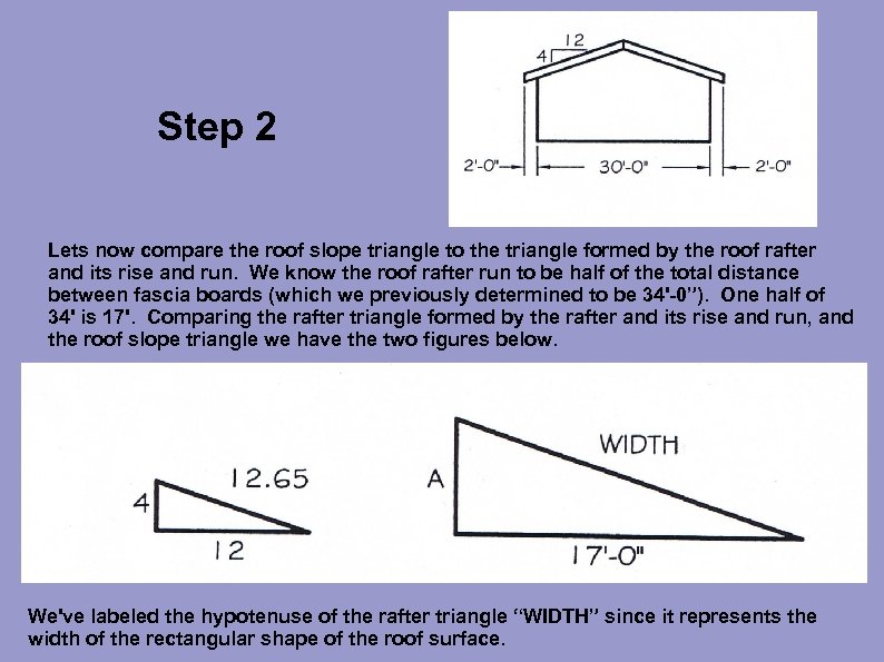 Step 2 Lets now compare the roof slope triangle to the triangle formed by the roof rafter and its rise and run. We know the roof rafter run to be half of the total distance between fascia boards (which we previously determined to be 34'-0”). One half of 34' is 17'. Comparing the rafter triangle formed by the rafter and its rise and run, and the roof slope triangle we have the two figures below. We've labeled the hypotenuse of the rafter triangle “WIDTH” since it represents the width of the rectangular shape of the roof surface.