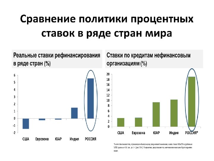 Рекомендации МВФ для России и США Для России: «Для выполнения установленного Банком России на 2015 г. целевого показателя по инфляции … Банку России следует быть готовым в течение следующего года дополнительно повысить процентные ставки» МВФ. Российская Федерация – Консультации 2014 года в соответствии со Статьей IV. 30. 04. 2014. С. 3. Для США: «Преждевременное повышение ставок может вызвать ужесточение финансовых условий или расшатывание финансовой стабильности, что будет препятствовать росту экономики» 2015 Article IV Consultation with the United States of America Concluding Statement of the IMF Mission. 28. 05. 2015.