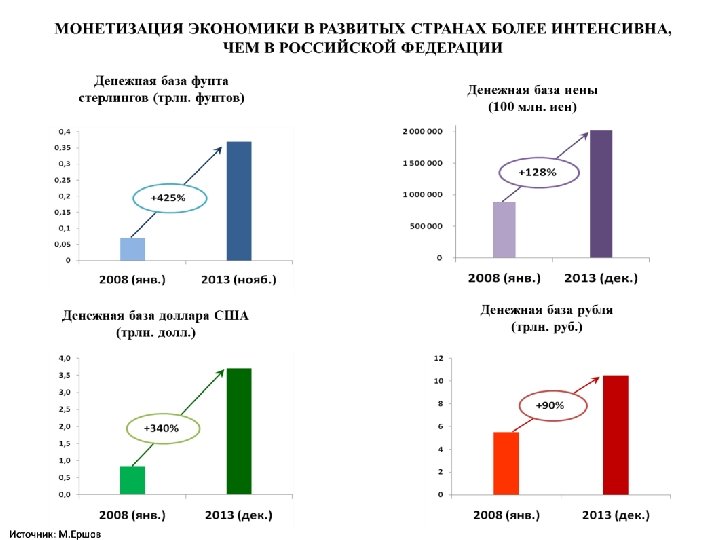 Прирост денежной базы валют стран в 2007 -2014 гг. (рассчитано по национальным валютам), % 800% 722% 700% 600% 500% 388% 400% 300% 187% 200% 100% 42% 0% Швейцария США Япония Зона евро