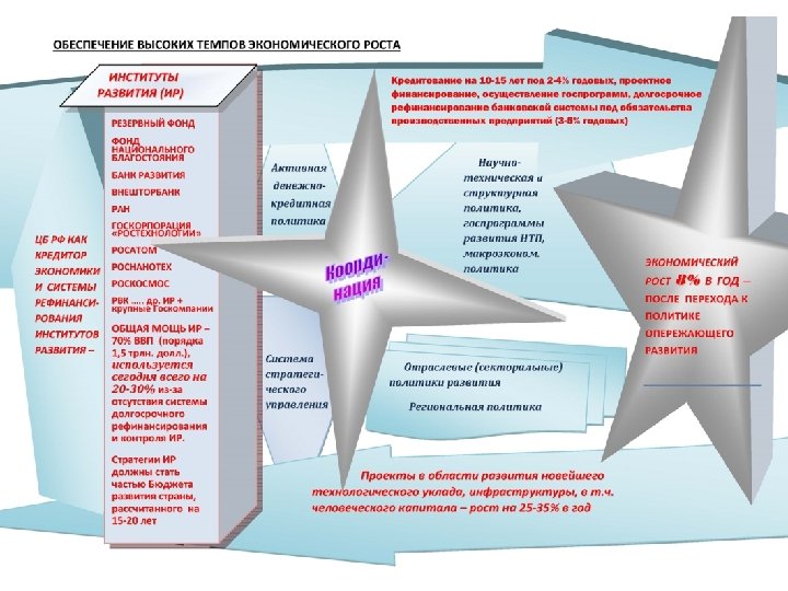 Цели развития экономики, поставленные Президентом России ДИВЕРСИФИКАЦИЯ ЭКОНОМИКИ Увеличение доли продукции высокотехнологичных и наукоёмких отраслей экономики в ВВП к 2018 году в 1, 3 раза относительно уровня 2011 года Увеличение объёма инвестиций не менее чем до 25 процентов внутреннего валового продукта к 2015 году и до 27 процентов – к 2018 году Достижение к 2020 году четырехкратного повышения производительности труда в основных секторах российской экономики Доведение уровня накопления до 30% от ВВП ДОСТИЖЕНИЕ ЭТИХ ЦЕЛЕЙ, НЕОБХОДИМЫХ ДЛЯ ОБЕСПЕЧЕНИЯ УСТОЙЧИВОГО РАЗВИТИЯ РОССИИ, НЕВОЗМОЖНО БЕЗ РЕАЛИЗАЦИИ СООТВЕТСТВУЮЩЕЙ ИМ ДКП