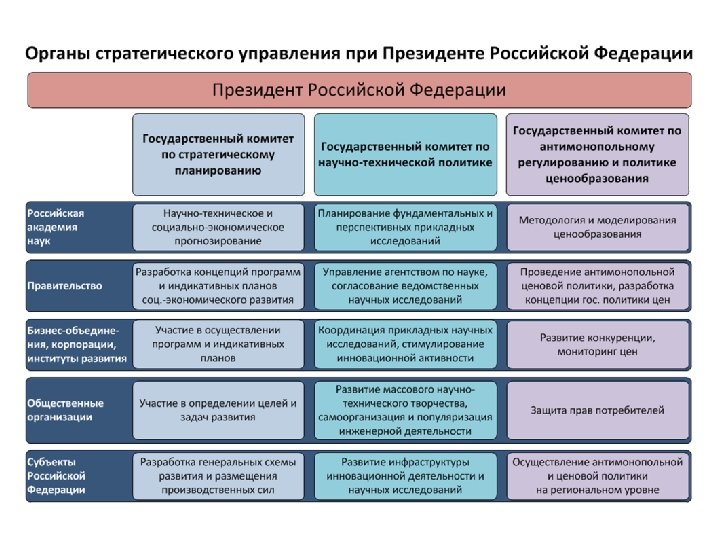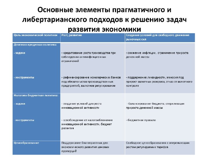 Промышленная политика Выращивание конкурентоспособных корпораций на основе стимулирования использования новых технологий Привлечение транснациональных корпораций для сборки иностранной техники Институты развития Наращивание институтов развития, Ограничение институтов развития создание системы их рефинансирования, бюджетными ассигнованиями, приватизация активное использование государственных корпораций Трудовые отношения Повышение производительности труда, вовлечение трудовых коллективов в управление предприятиями Свободный рынок труда, расширение трудовой иммиграции Природопользование Изъятие природной ренты в доход государства за счет экспортных пошлин, налоги на дополнительный доход у недропользователей, платежи за загрязнения окружающей среды в систему экологических фондов Налог на добычу полезных ископаемых, экологический налог Государственное управление Создание системы стратегического управления на основе программноцелевого подхода Создание рынка государственных услуг Ожидаемые результаты Модернизация и развитие экономики, ежегодный прирост ВВП 6 -8%, инвестиций – 15 -20% Сырьевая специализация экономики, ежегодный прирост экономики 1 -2%, доминирование иностранного капитала
