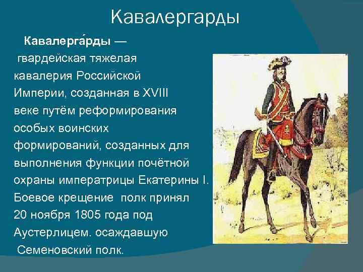 Кавалергарды Кавалерга рды — гвардейская тяжелая кавалерия Российской Империи, созданная в XVIII веке путём реформирования особых воинских формирований, созданных для выполнения функции почётной охраны императрицы Екатерины I. Боевое крещение полк принял 20 ноября 1805 года под Аустерлицем. осаждавшую Семеновский полк.