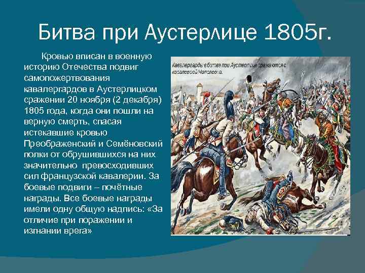Битва при Аустерлице 1805 г. Кровью вписан в военную историю Отечества подвиг самопожертвования кавалергардов в Аустерлицком сражении 20 ноября (2 декабря) 1805 года, когда они пошли на верную смерть, спасая истекавшие кровью Преображенский и Семёновский полки от обрушившихся на них значительно превосходивших сил французской кавалерии. За боевые подвиги – почётные награды. Все боевые награды имели одну общую надпись: «За отличие при поражении и изгнании врега»