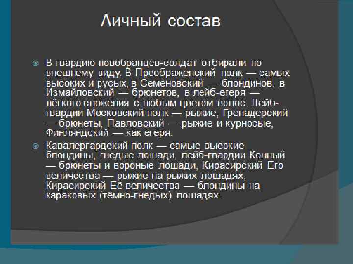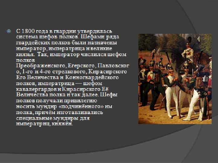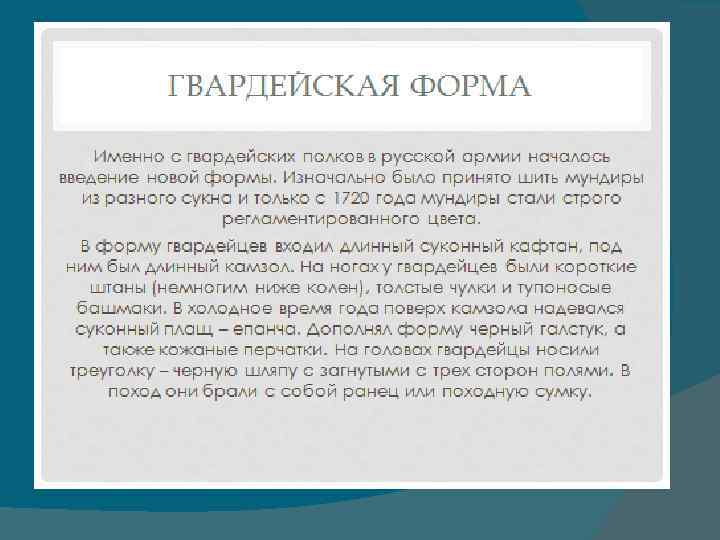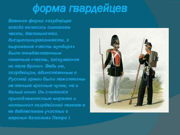 форма гвардейцев Военная форма гвардейцев всегда являлась символом чести, достоинства, дисциплинированности, а выражение «честь мундира» было тождественным понятию «честь, заслуженная на поле брани» . Ведь им, гвардейцам, единственным в Русской армии были пожалованы не только красные чулки, но и белый кант. Он считался принадлежностью моряков и напоминал гвардейской пехоте о ее доблестном участии в морских баталиях Петра I.