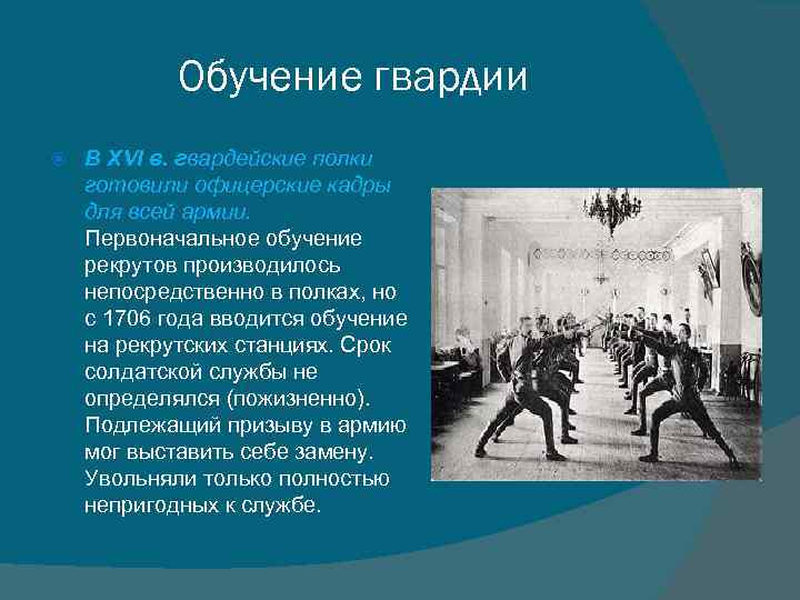 Обучение гвардии В XVI в. гвардейские полки готовили офицерские кадры для всей армии. Первоначальное обучение рекрутов производилось непосредственно в полках, но с 1706 года вводится обучение на рекрутских станциях. Срок солдатской службы не определялся (пожизненно). Подлежащий призыву в армию мог выставить себе замену. Увольняли только полностью непригодных к службе.