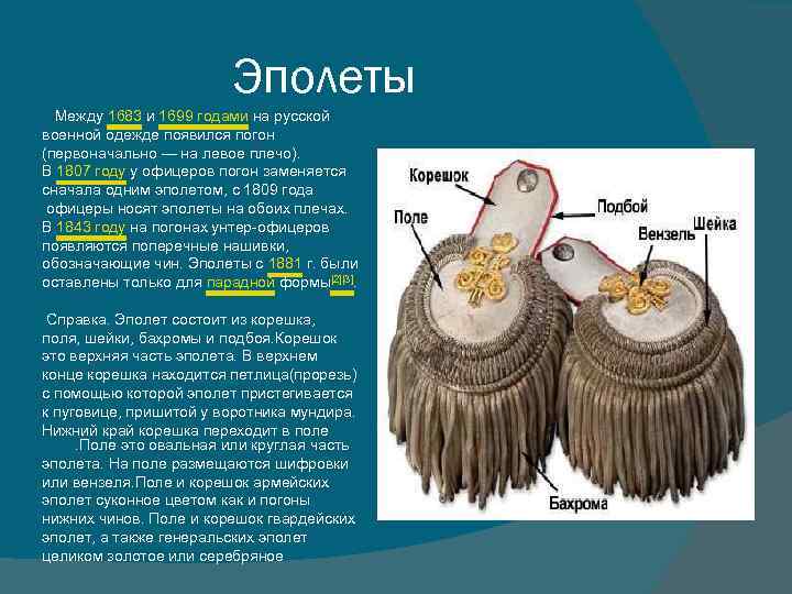 Эполеты Между 1683 и 1699 годами на русской военной одежде появился погон (первоначально — на левое плечо). В 1807 году у офицеров погон заменяется сначала одним эполетом, с 1809 года офицеры носят эполеты на обоих плечах. В 1843 году на погонах унтер-офицеров появляются поперечные нашивки, обозначающие чин. Эполеты с 1881 г. были оставлены только для парадной формы[2][3]. Справка. Эполет состоит из корешка, поля, шейки, бахромы и подбоя. Корешок это верхняя часть эполета. В верхнем конце корешка находится петлица(прорезь) с помощью которой эполет пристегивается к пуговице, пришитой у воротника мундира. Нижний край корешка переходит в поле . Поле это овальная или круглая часть эполета. На поле размещаются шифровки или вензеля. Поле и корешок армейских эполет суконное цветом как и погоны нижних чинов. Поле и корешок гвардейских эполет, а также генеральских эполет целиком золотое или серебряное