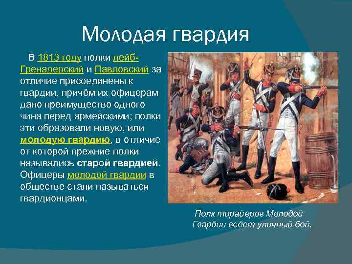 Молодая гвардия В 1813 году полки лейб. Гренадерский и Павловский за отличие присоединены к гвардии, причём их офицерам дано преимущество одного чина перед армейскими; полки эти образовали новую, или молодую гвардию, в отличие от которой прежние полки назывались старой гвардией. Офицеры молодой гвардии в обществе стали называться гвардионцами. Полк тирайеров Молодой Гвардии ведет уличный бой.