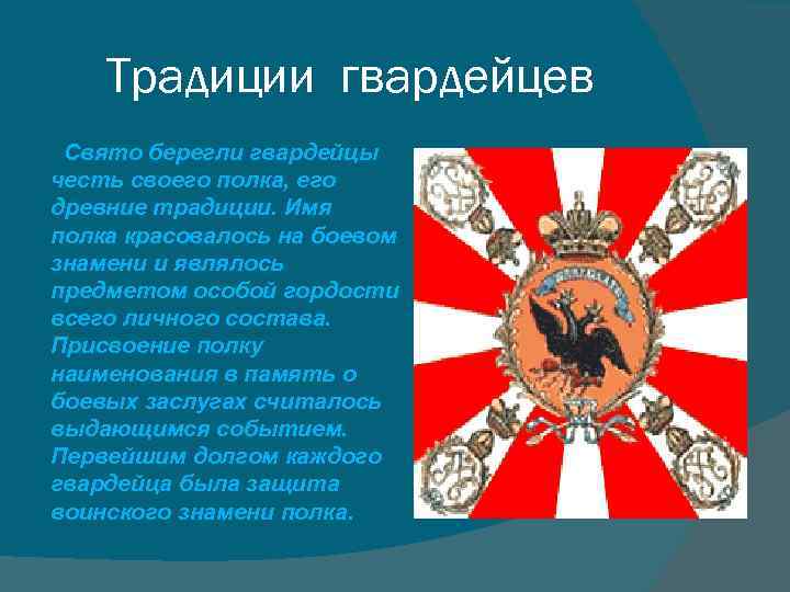 Традиции гвардейцев Свято берегли гвардейцы честь своего полка, его древние традиции. Имя полка красовалось на боевом знамени и являлось предметом особой гордости всего личного состава. Присвоение полку наименования в память о боевых заслугах считалось выдающимся событием. Первейшим долгом каждого гвардейца была защита воинского знамени полка.