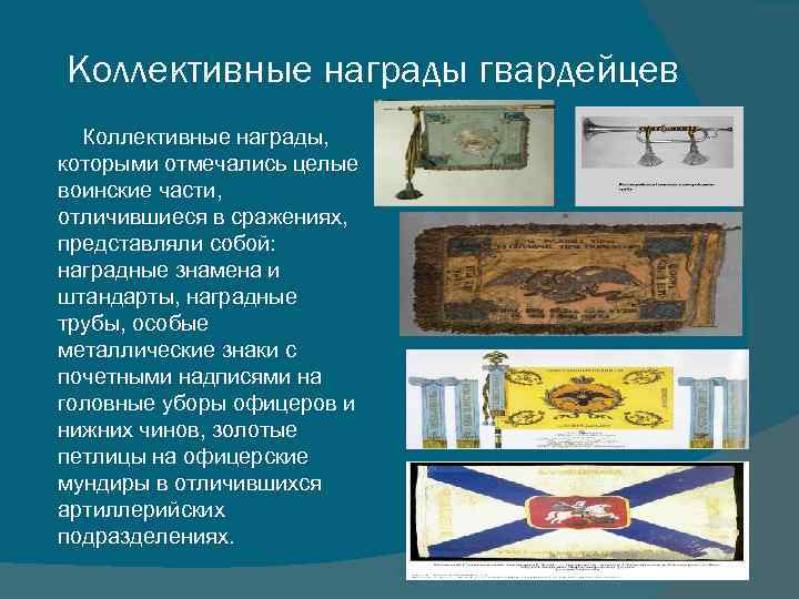 Коллективные награды гвардейцев Коллективные награды, которыми отмечались целые воинские части, отличившиеся в сражениях, представляли собой: наградные знамена и штандарты, наградные трубы, особые металлические знаки с почетными надписями на головные уборы офицеров и нижних чинов, золотые петлицы на офицерские мундиры в отличившихся артиллерийских подразделениях.