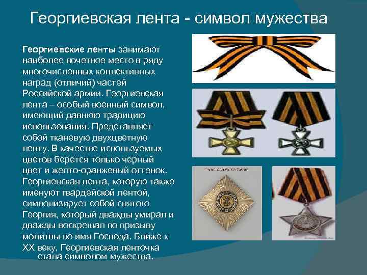 Георгиевская лента - символ мужества Георгиевские ленты занимают наиболее почетное место в ряду многочисленных коллективных наград (отличий) частей Российской армии. Георгиевская лента – особый военный символ, имеющий давнюю традицию использования. Представляет собой тканевую двухцветную ленту. В качестве используемых цветов берется только черный цвет и желто-оранжевый оттенок. Георгиевская лента, которую также именуют гвардейской лентой, символизирует собой святого Георгия, который дважды умирал и дважды воскрешал по призыву молитвы во имя Господа. Ближе к XX веку, Георгиевская ленточка стала символом мужества.