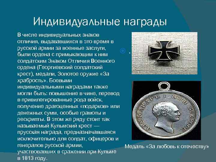 Индивидуальные награды В числе индивидуальных знаков отличия, выдававшихся в это время в русской армии за военные заслуги, были ордена с примыкающим к ним солдатским Знаком Отличия Военного ордена (Георгиевский солдатский крест), медали, Золотое оружие «За храбрость» . Боевыми индивидуальными наградами также могли быть: повышение в чине, перевод в привилегированные рода войск, получение драгоценных «подарков» или денежных сумм, особые грамоты и рескрипты. В этом же ряду стоит так называемый Кульмский крест — прусская награда, предназначавшаяся исключительно для солдат, офицеров и генералов русской армии, Медаль «За любовь к отечеству» участвовавших в сражении при Кульме в 1813 году. .
