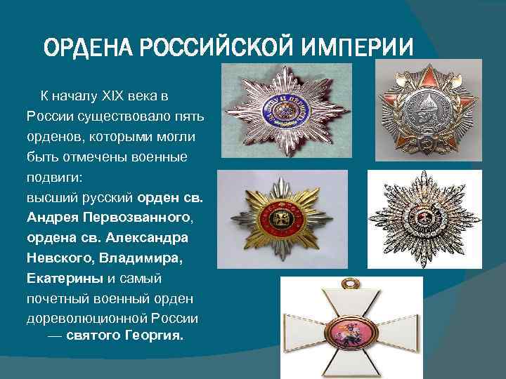 ОРДЕНА РОССИЙСКОЙ ИМПЕРИИ К началу XIX века в России существовало пять орденов, которыми могли быть отмечены военные подвиги: высший русский орден св. Андрея Первозванного, ордена св. Александра Невского, Владимира, Екатерины и самый почетный военный орден дореволюционной России — святого Георгия.