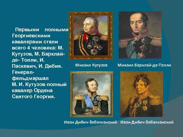 Первыми полными Георгиевскими кавалерами стали всего 4 человека: М. Кутузов, М. Барклайде- Толли, И. Паскевич, И. Дибия. Генералфельдмаршал М. И. Кутузов полный кавалер Ордена Святого Георгия. Михаил Кутузов Михаил Барклай-де-Толли Иван Дибич-Забалканский