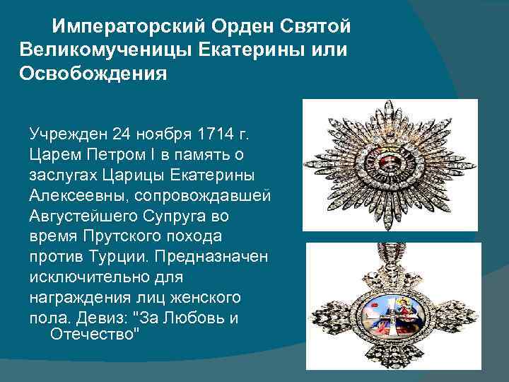 Императорский Орден Святой Великомученицы Екатерины или Освобождения Учрежден 24 ноября 1714 г. Царем Петром I в память о заслугах Царицы Екатерины Алексеевны, сопровождавшей Августейшего Супруга во время Прутского похода против Турции. Предназначен исключительно для награждения лиц женского пола. Девиз: "За Любовь и Отечество"