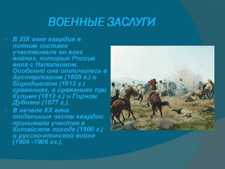 ВОЕННЫЕ ЗАСЛУГИ В XIX веке гвардия в полном составе участвовала во всех войнах, которые Россия вела с Наполеоном. Особенно она отличилась в Аустерлицком (1805 г. ) и Бородинском (1812 г. ) сражениях, в сражениях при Кульме (1813 г. ) и Горном Дубняке (1877 г. ). В начале XX века отдельные части гвардии принимали участие в Китайском походе (1900 г. ) и русско-японской войне (1904 -1905 гг. ).