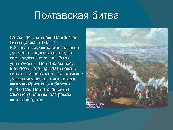 Полтавская битва Затем наступил день Полтавской битвы (27 июня 1709 г. ) В 3 часа произошло столкновение русской и шведской кавалерии – две шведские колонны были уничтожены в Полтавском лесу. В 9 часов Пётр. I приказал подать сигнал к общей атаке. Под натиском русских идущих в штыки, войска шведов обратились в бегство К 11 часам Полтавская битва закончена полным разгромом шведской армии.