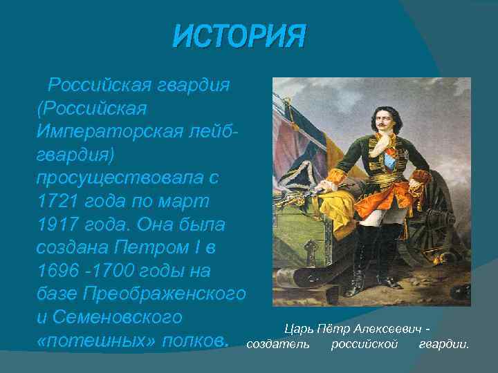 ИСТОРИЯ Российская гвардия (Российская Императорская лейбгвардия) просуществовала с 1721 года по март 1917 года. Она была создана Петром I в 1696 -1700 годы на базе Преображенского и Семеновского Царь Пётр Алексеевич «потешных» полков. создатель российской гвардии.