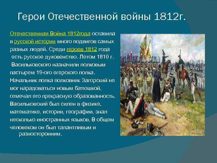 Герои Отечественной войны 1812 г. Отечественная Война 1812 года оставила в русской истории много подвигов самых разных людей. Среди героев 1812 года есть русское духовенство. Летом 1810 г. Васильковского назначили полковым пастырем 19 -ого егерского полка. Начальник полка полковник Загорский не мог нарадоваться новым батюшкой, отмечал его прекрасную образованность. Васильковский был силен в физике, математике, истории, географии, знал несколько иностранных языков. В общем человеком он был талантливым и разносторонним.