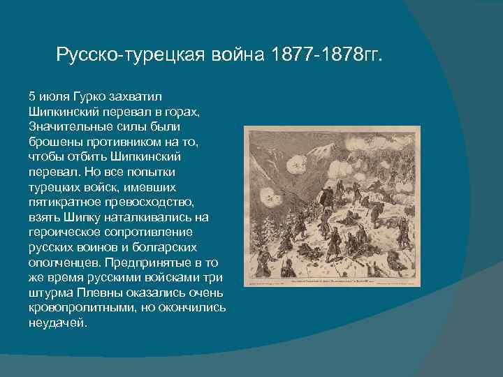 Русско-турецкая война 1877 -1878 гг. 5 июля Гурко захватил Шипкинский перевал в горах, Значительные силы были брошены противником на то, чтобы отбить Шипкинский перевал. Но все попытки турецких войск, имевших пятикратное превосходство, взять Шипку наталкивались на героическое сопротивление русских воинов и болгарских ополченцев. Предпринятые в то же время русскими войсками три штурма Плевны оказались очень кровопролитными, но окончились неудачей.