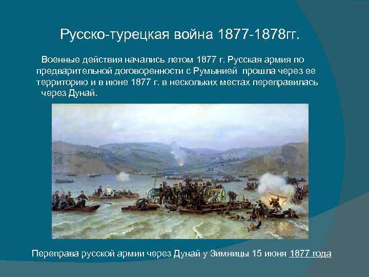 Русско-турецкая война 1877 -1878 гг. Военные действия начались летом 1877 г. Русская армия по предварительной договоренности с Румынией прошла через ее территорию и в июне 1877 г. в нескольких местах переправилась через Дунай. Переправа русской армии через Дунай у Зимницы 15 июня 1877 года