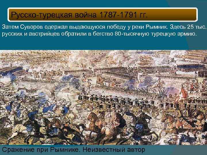 Русско-турецкая война 1787 -1791 гг. Затем Суворов одержал выдающуюся победу у реки Рымник. Здесь 25 тыс. русских и австрийцев обратили в бегство 80 -тысячную турецкую армию. Сражение при Рымнике. Неизвестный автор