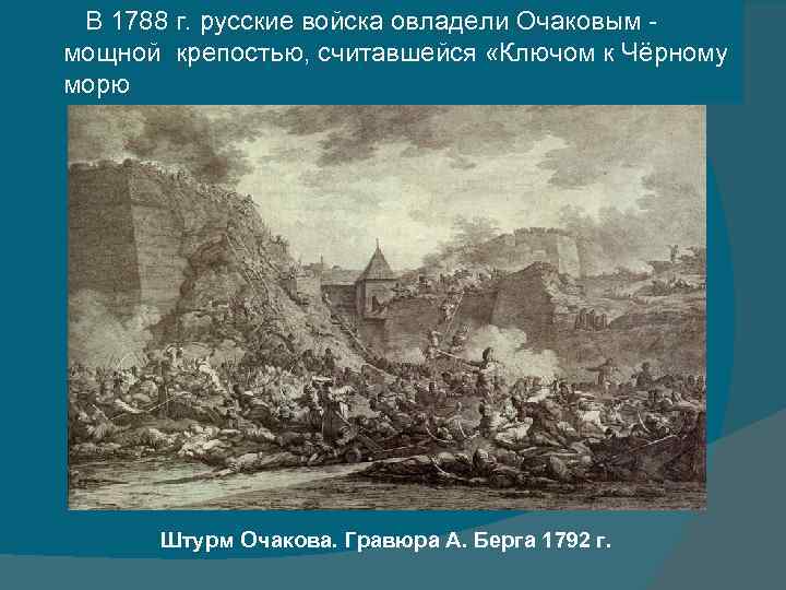 В 1788 г. русские войска овладели Очаковым - мощной крепостью, считавшейся «Ключом к Чёрному морю Штурм Очакова. Гравюра А. Берга 1792 г.