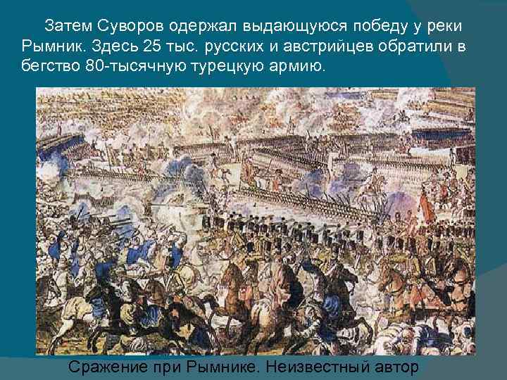 Затем Суворов одержал выдающуюся победу у реки Рымник. Здесь 25 тыс. русских и австрийцев обратили в бегство 80 -тысячную турецкую армию. Сражение при Рымнике. Неизвестный автор