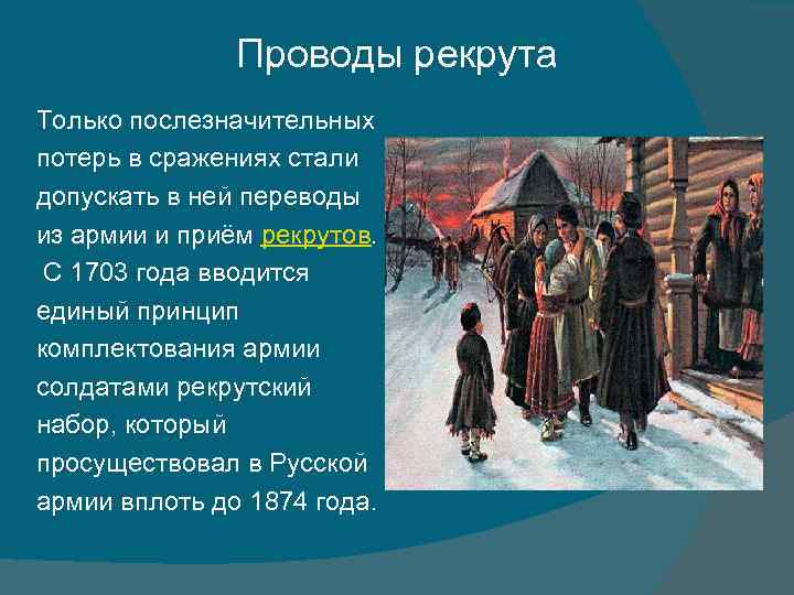 Проводы рекрута Только послезначительных потерь в сражениях стали допускать в ней переводы из армии и приём рекрутов. С 1703 года вводится единый принцип комплектования армии солдатами рекрутский набор, который просуществовал в Русской армии вплоть до 1874 года.