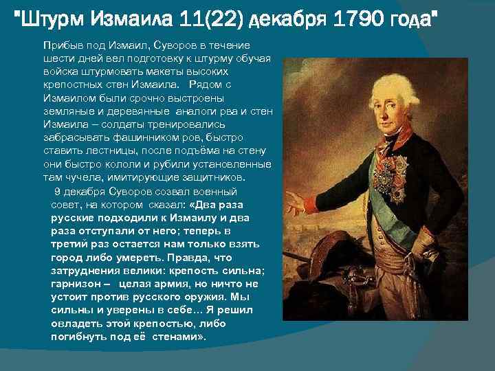 "Штурм Измаила 11(22) декабря 1790 года" Прибыв под Измаил, Суворов в течение шести дней вел подготовку к штурму обучая войска штурмовать макеты высоких крепостных стен Измаила. Рядом с Измаилом были срочно выстроены земляные и деревянные аналоги рва и стен Измаила – солдаты тренировались забрасывать фашинником ров, быстро ставить лестницы, после подъёма на стену они быстро кололи и рубили установленные там чучела, имитирующие защитников. 9 декабря Суворов созвал военный совет, на котором сказал: «Два раза русские подходили к Измаилу и два раза отступали от него; теперь в третий раз остается нам только взять город либо умереть. Правда, что затруднения велики: крепость сильна; гарнизон – целая армия, но ничто не устоит против русского оружия. Мы сильны и уверены в себе… Я решил овладеть этой крепостью, либо погибнуть под её стенами» .