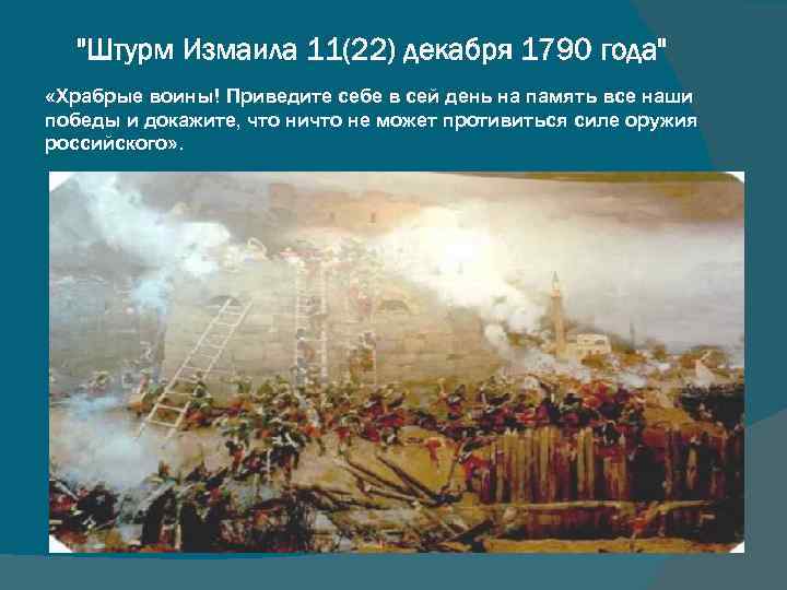 "Штурм Измаила 11(22) декабря 1790 года" «Храбрые воины! Приведите себе в сей день на память все наши победы и докажите, что ничто не может противиться силе оружия российского» .
