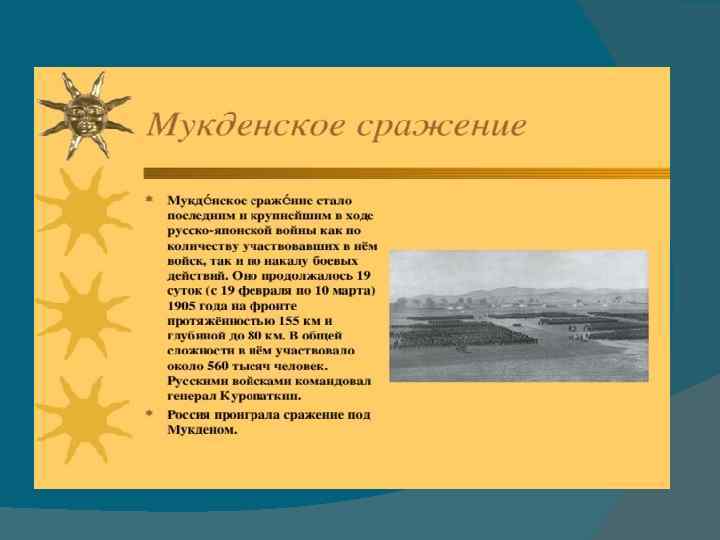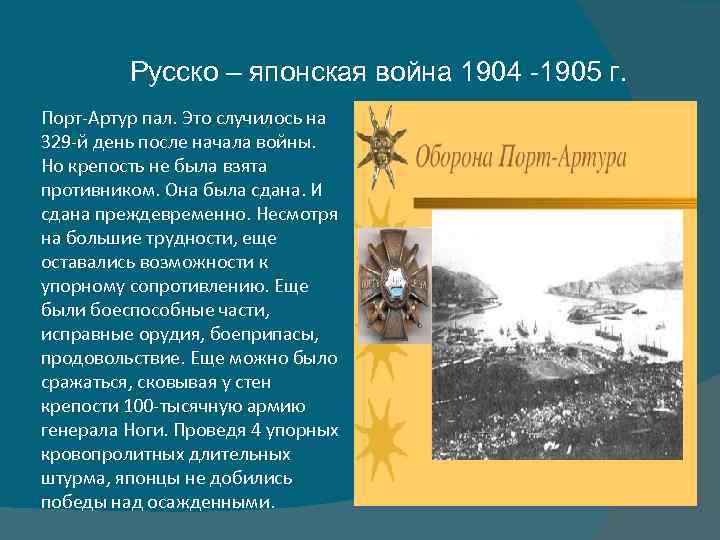 Русско – японская война 1904 -1905 г. Порт-Артур пал. Это случилось на 329 -й день после начала войны. Но крепость не была взята противником. Она была сдана. И сдана преждевременно. Несмотря на большие трудности, еще оставались возможности к упорному сопротивлению. Еще были боеспособные части, исправные орудия, боеприпасы, продовольствие. Еще можно было сражаться, сковывая у стен крепости 100 -тысячную армию генерала Ноги. Проведя 4 упорных кровопролитных длительных штурма, японцы не добились победы над осажденными.