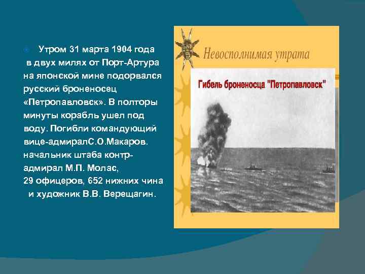 Утром 31 марта 1904 года в двух милях от Порт-Артура на японской мине подорвался русский броненосец «Петропавловск» . В полторы минуты корабль ушел под воду. Погибли командующий вице-адмирал. С. О. Макаров. начальник штаба контрадмирал М. П. Молас, 29 офицеров, 652 нижних чина и художник В. В. Верещагин.