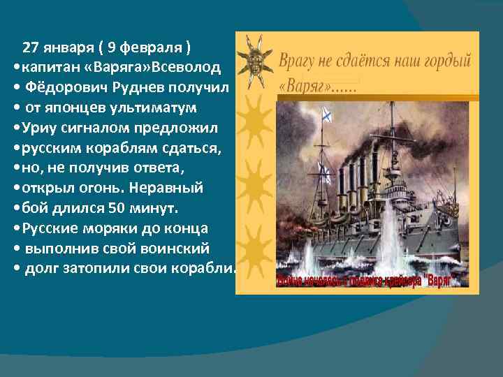 27 января ( 9 февраля ) • капитан «Варяга» Всеволод • Фёдорович Руднев получил • от японцев ультиматум • Уриу сигналом предложил • русским кораблям сдаться, • но, не получив ответа, • открыл огонь. Неравный • бой длился 50 минут. • Русские моряки до конца • выполнив свой воинский • долг затопили свои корабли.