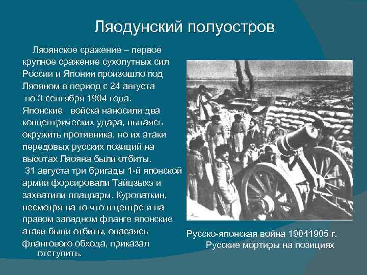 Ляодунский полуостров Ляоянское сражение – первое крупное сражение сухопутных сил России и Японии произошло под Ляояном в период с 24 августа по 3 сентября 1904 года. Японские войска наносили два концентрических удара, пытаясь окружить противника, но их атаки передовых русских позиций на высотах Ляояна были отбиты. 31 августа три бригады 1 -й японской армии форсировали Тайцзыхэ и захватили плацдарм. Куропаткин, несмотря на то что в центре и на правом западном фланге японские атаки были отбиты, опасаясь Русско-японская война 19041905 г. флангового обхода, приказал Русские мортиры на позициях отступить.