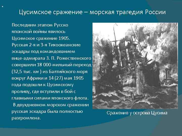 • Цусимское сражение – морская трагедия России Последним этапом Русско японской войны явилось Цусимское сражение 1905. Русская 2 -я и 3 -я Тихоокеанские эскадры под командованием вице-адмирала З. П. Рожественского совершили 18 000 -мильный переход (32, 5 тыс. км ) из Балтийского моря вокруг Африки и 14 (27) мая 1905 года подошли к Цусимскому проливу, где вступили в бой с главными силами японского флота. В двухдневном морском сражении русская эскадра была полностью разгромлена. Сражение у острова Цусима