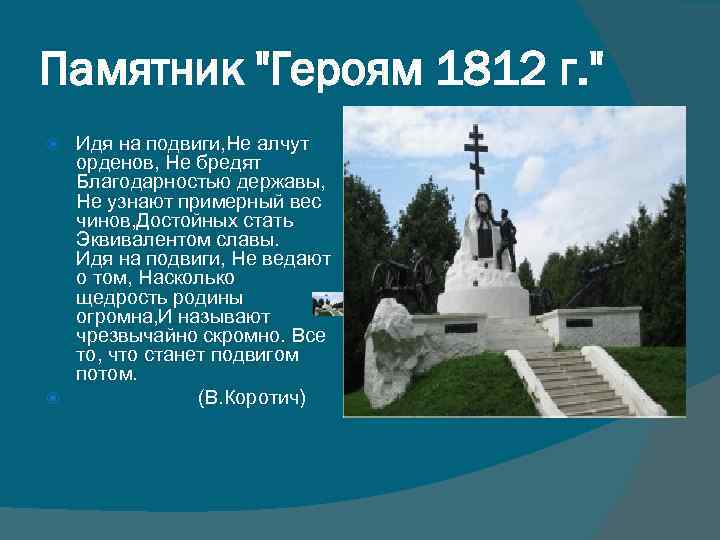 Памятник "Героям 1812 г. " Идя на подвиги, Не алчут орденов, Не бредят Благодарностью державы, Не узнают примерный вес чинов, Достойных стать Эквивалентом славы. Идя на подвиги, Не ведают о том, Насколько щедрость родины огромна, И называют чрезвычайно скромно. Все то, что станет подвигом потом. (В. Коротич)