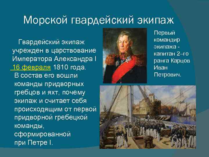 Морской гвардейский экипаж Гвардейский экипаж учрежден в царствование Императора Александра I 16 февраля 1810 года. В состав его вошли команды придворных гребцов и яхт, почему экипаж и считает себя происходящим от первой придворной гребецкой команды, сформированной при Петре I. Первый командир экипажа - капитан 2–го ранга Карцов Иван Петрович.