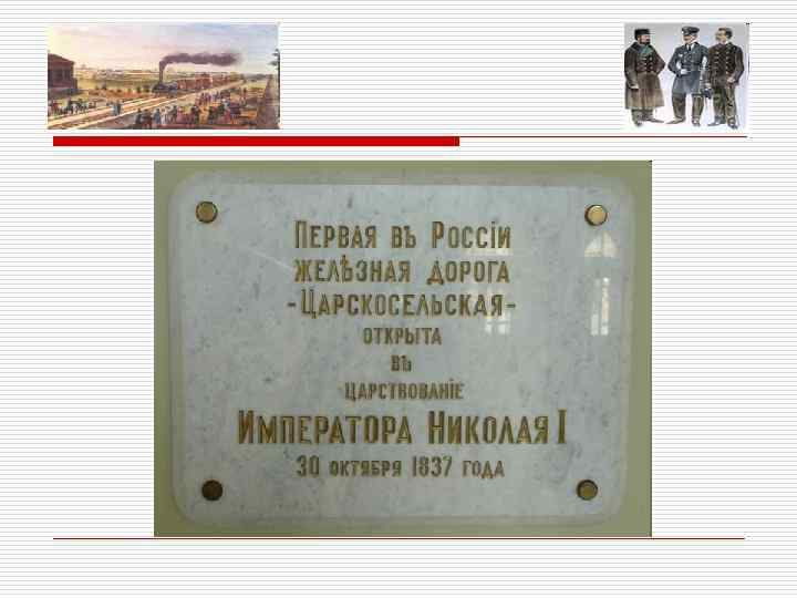Первая железная дорога o История железных дорог в России начинается с 1830 -х годов. В 1834 году по приглашению горного ведомства в Россию прибыл австрийский инженер Франц фон Герстнер, который внёс императору Николаю I предложение о строительстве железнодорожной линии. В 1836 году император обнародовал указ о сооружении Царскосельской железной дороги. За несколько месяцев был построен пусковой участок от Кузьмино до Павловска, на котором к концу года было запущено движение, а официальное открытие дороги состоялось в конце 1837 года.