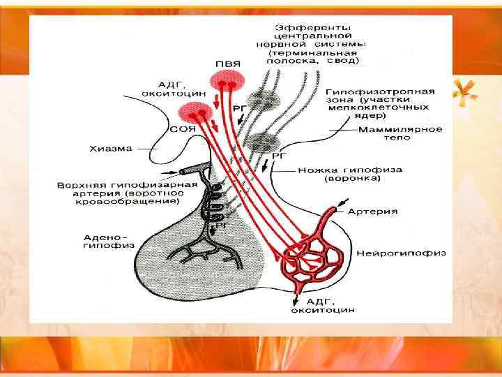 Гуморальная регуляция: Задняя доля гипофиза отделена от передней. Она не имеет железистого строения и не производит гормонов. Функционально задняя доля гипофиза связана с супраоптическим и паравентрикулярным ядрами гипоталамуса. В этих ядрах, пучок нервных волокон от которых направляется к задней доле гипофиза, происходит выработка окситоцина.