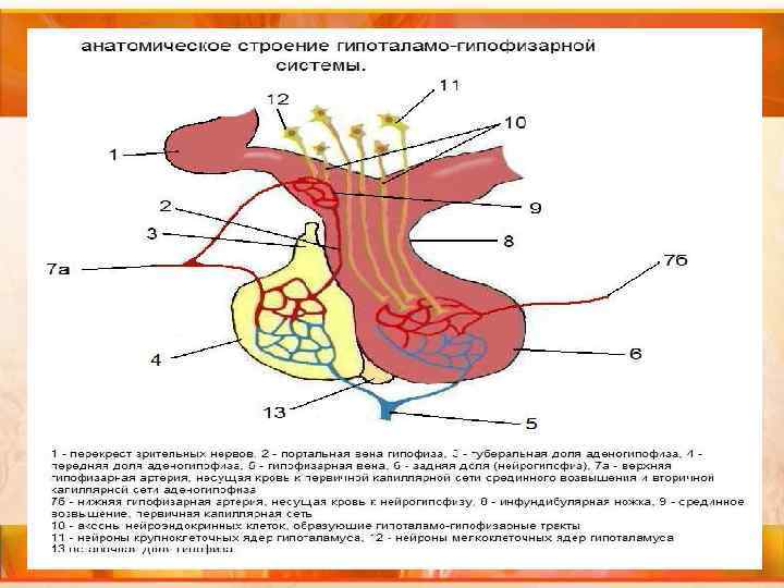 Гуморальная регуляция: Гипоталамус находится в основании головного мозга, образуя дно и часть стенок третьего желудочка. Гипоталамус имеет нервные связи как с вышележащими отделами головного мозга, так и с гипофизом. Кроме того, от гипоталамуса отходят волокна парасимпатических и симпатических нервов, идущих в спинной мозг.