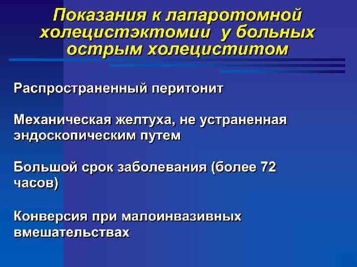 Методы лечения острого холецистита Принципы консервативного лечения n Функциональный покой l Голод, локальная гипотермия n Спазмолитическая терапия n Антибактериальная терапия l Антибиотики широкого спектра действия n Дезинтоксикационная инфузионная терапия n Противовоспалительное лечение l Местное (локальная гипотермия) l Системное (нестероидные противовоспалительные препараты)