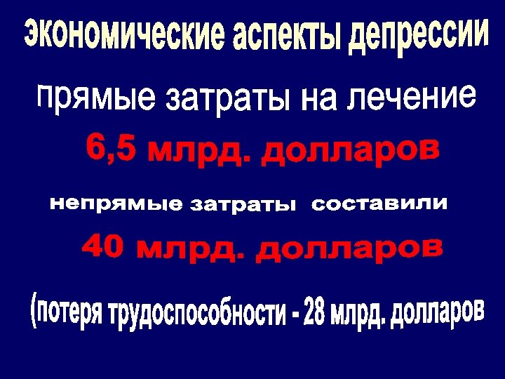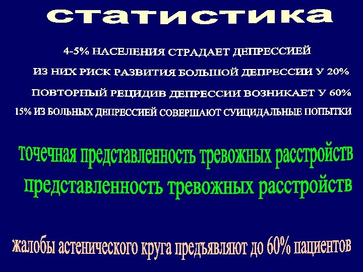 Распространенность • 18 -25% женщин и 7 -12% мужчин из всего населения хотя бы раз в жизни перенесли депрессивное состояние • Женщины страдают депрессией в 2 раза чаще, чем мужчины • Частота депрессий у больных соматических и неврологических стационаров достигает 57%